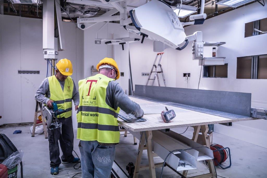 Η κατασκευή μίας Χειρουργικής αίθουσας έχει συγκεκριμένες προδιαγραφές σε οικοδομικά υλικά (ξηρά δόμηση) και σε ηλεκτρομηχανολιγό εξοπλισμό. Η εταιρεία μας κατασκεύασε τις αίθουσες με όλες τις προδιαγραφές: αγώγιμα δάπεδα, ιατρικά αέρια, ειδικά χειρουργικά φώτα και επένδυση τοιχοποιίας με πιστοποιημένο αντιμικροβιακό υλικό επένδυσης PALCLAD™ Pro το οποίο είναι ένα σύστημα επένδυσης που αποτελείται από συμπαγή πάνελ PVC που προσφέρει πλήρη δυνατότητα επικάλυψης επιφανειών, δημιουργεί ένα αντιμικροβιακό περιβάλλον, είναι ανθεκτικό, με πληθώρα επιλογής χρωμάτων, ανθεκτικό στους κραδασμούς, στη φωτιά, με ηλεκτρική και θερμική μόνωση. Ταυτόχρονα, το PALCLAD είναι ένα υλικό φιλικό στο περιβάλλον, υψηλής αισθητικής που αναβαθμίζει την ποιότητα του χώρου.