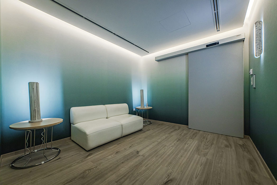 Στόχος ήταν η δημιουργία ενός μοντέρνου αλλά και ταυτόχρονα χαλαρωτικού χώρου τόσο για τους νέου γονείς, όσο και για τα νεογνά. Στο χώρο αυτό λοιπόν, έγινε συνδυασμός των αποχρώσεων του τυρκουάζ στους τοίχους και απαλού θερμού φωτός με κρυφό φωτισμού οροφής και τοποθέτηση επιτοιχων φωτιστικών.